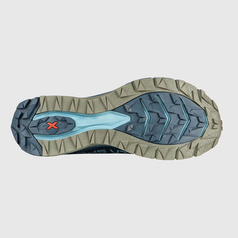 El inserto delantero mejora la amortiguación, mientras que el inserto posterior aporta estabilidad en carrera. La mediasuela incluye además un inserto Rock-Shield en EVA de alta densidad para una mayor protección.